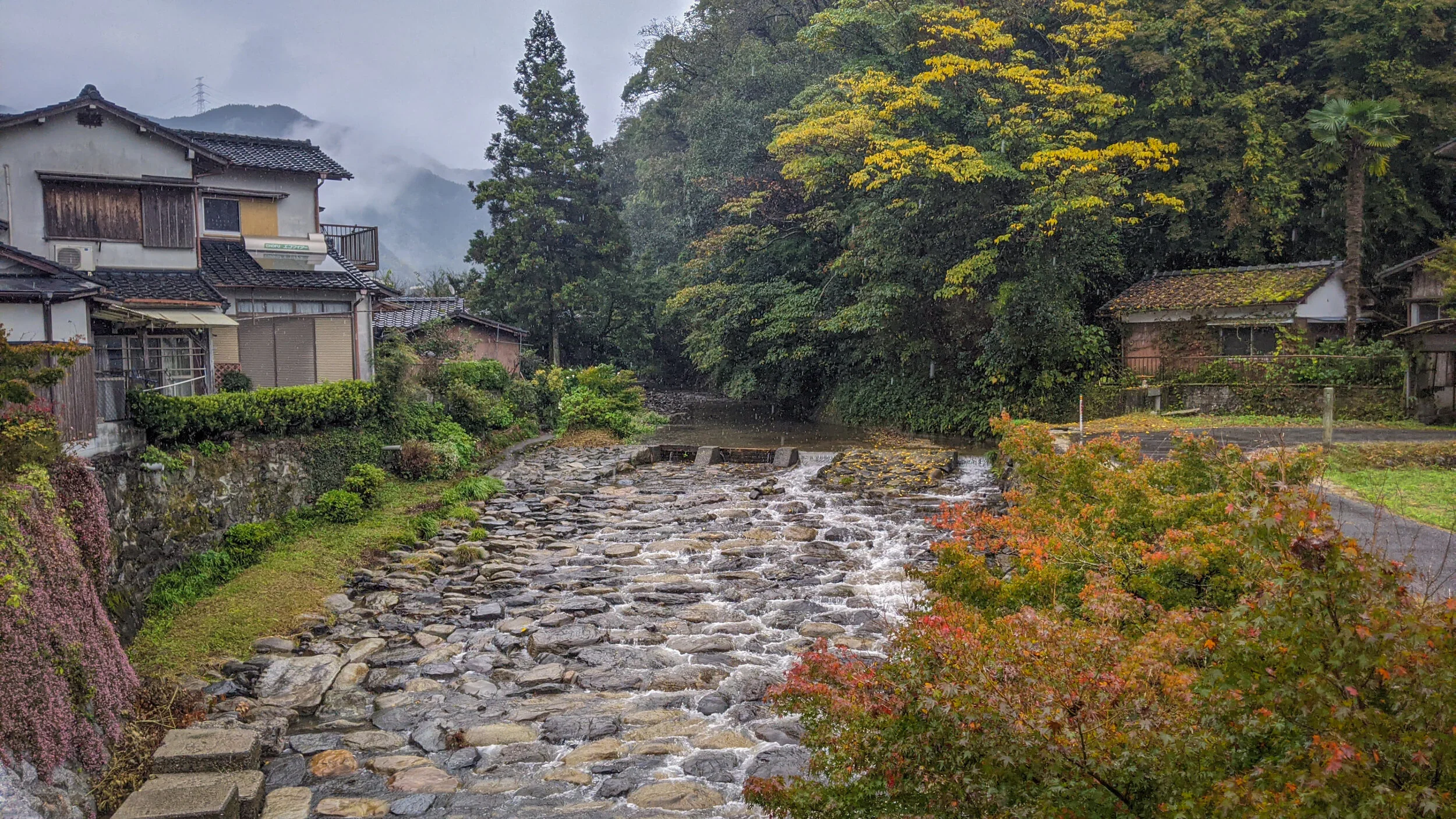 The next morning we woke up to gentle but constant rainfall, and got to experience Akizuki town in a totally different light! The fog rolling over the hills, the grey clouds, and the wet pavement gives the town a darker vibe that feels quite mysterious - as if you’ve stepped back in time. Hardly anyone is out on the streets, and it feels like a ghost town, although I know that isn’t true - it was like we had the entire town to ourselves.